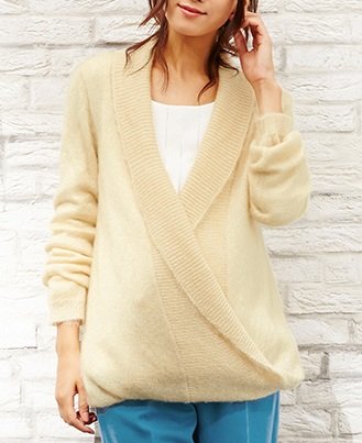 モヘア混ならではの毛足の長さが魅力のフェミニンニットカーディガンです。商品を編み上げてから起毛加工をほどこしているので一層ふわふわとした風合いに。そのままで着るとシンプルなAラインシルエット。裾の両脇にあるボタンをとめるとカシュクールデザインも楽しめる2WAY仕様です。