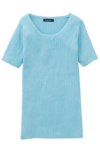 レーヨンと綿なので吸汗性がよいのも好ポイント。暑い季節にうれしい素材です 編み目の凹凸が縦ラインを強調して、伸縮性もあり、体に優しくフィットしてほっそり見えるリブニットです。