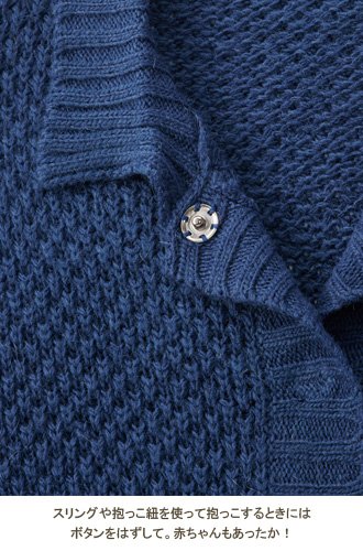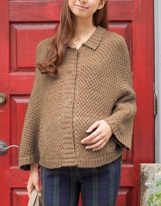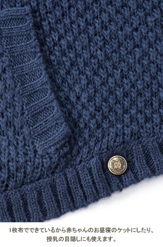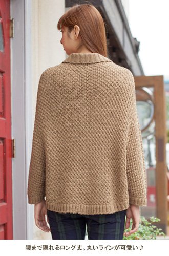 ふんわりと編み上げ、柔らかい仕上がり。編み地がデザインのポイントです。赤ちゃんを抱っこしていてもさっと羽織れる手軽さがママには嬉しい。妊娠中から育児中まで長~く使えるポンチョです。