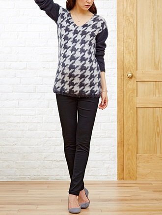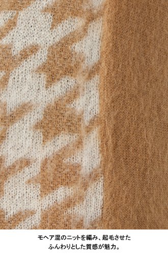 編み上げた後にふんわりと起毛させたやわらかな肌触りのモヘア混ニット。ふわふわとした素材感が見た目にもあたたかそうです。大きな千鳥柄でトレンド感もプラス。モード感を演出するコーディネートの主役になるアイテムです。Vネックで顔まわりをすっきりと。
