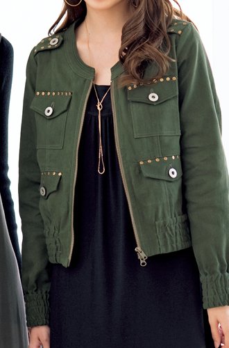 - ●前=ダブルオープンファスナー全開、肩章&布団とポケットのアンティークゴールドのスタッズ付、胸元左右フラップ付ネオバーボタン止め片玉縁ポケット、袖口&裾切り替えゴム入り