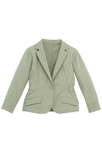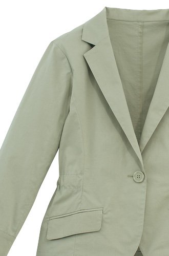 - ●前=1ボタン全開、左右フラップ付両玉縁ポケット、ウエスト=両サイド~後ろ内側にボタンホール付ゴム入り調節可、袖口カフススリット入り折り返し可