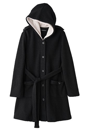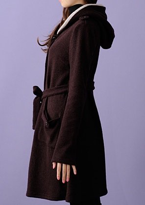 - ●前=ボタン全開 左右アウトポケットにタブ&飾りボタン付 肩章付 フードダブル仕立て ウエスト=共布ベルト付(共布ループ付/取り外し可)調節可