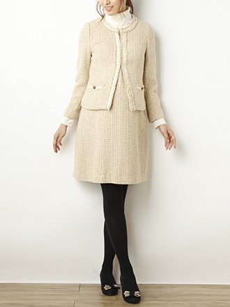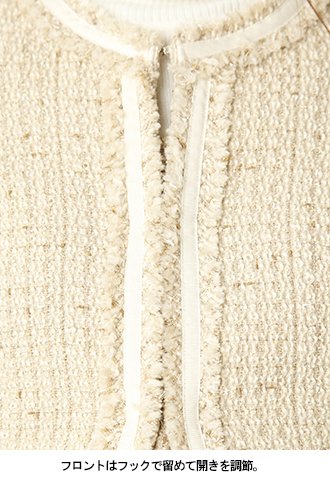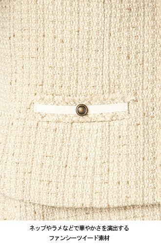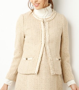 あたたかみを演出するネップやラメ糸など、さまざまな糸を組み合わせた表情豊かなファンシーツイード素材。秋冬らしい華やかな雰囲気が楽しめます。ノーブルで上品な雰囲気のノーカラージャケットは、合わせるアイテムによってきちんと感のあるお呼ばれスタイルから休日のカジュアルスタイルまで幅広く大活躍してくれます。お揃いのジャンパースカートやショートパンツとのセットアップも楽しめます。