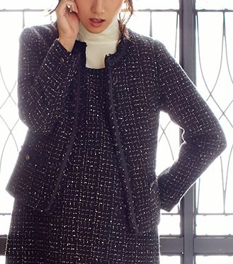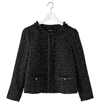 あたたかみを演出するネップやラメ糸など、さまざまな糸を組み合わせた表情豊かなファンシーツイード素材。秋冬らしい華やかな雰囲気が楽しめます。ノーブルで上品な雰囲気のノーカラージャケットは、合わせるアイテムによってきちんと感のあるお呼ばれスタイルから休日のカジュアルスタイルまで幅広く大活躍してくれます。お揃いのジャンパースカートやショートパンツとのセットアップも楽しめます。