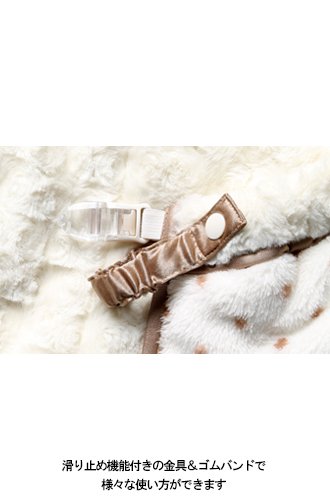 クリップとゴムバンドが付いているので抱っこやおんぶ、ベビーカーと幅広く使えます。