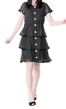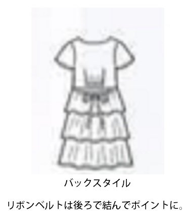 - ●前=ボタン半開(6番目からは飾り全開風)、ウエスト=切り替え共布リボンベルト付(糸ループ付/取り外し可)調節可、袖口、3段ティアードにサテンリボン付、後=切り替えセンターにゴムシャーリング
