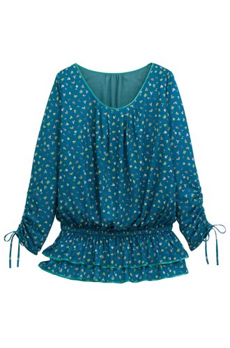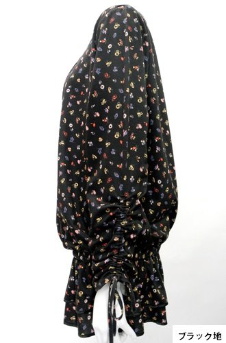 - ●衿ぐりサテントリミング、前タック入り、後ギャザー入り、ローウエスト切り替えにゴム入り、裾2段ティアードサテントリミング、袖に通し共布リボン調節可