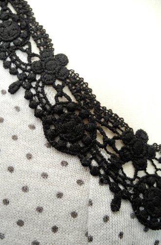 - ●素材/ウール混ラビローラン先染ニット天竺水玉抜染プリント薄起毛(アクリル84%、ナイロン10%、ウール6%)、レース(綿100%)