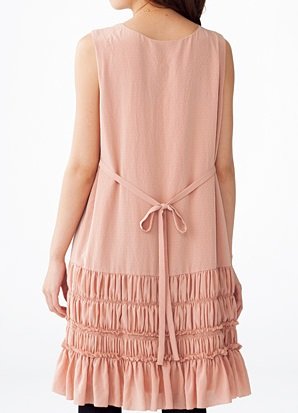 - ●ウエスト=共布リボンベルト付調節可 裾ゴムシャーリング、ギャザー&フリル切り替え、ピコカット仕立て