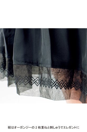 - ●ウエスト=共布リボンベルト付調節可 ジョーゼットのランダムプリーツ切り替え、裾にカットワーク刺しゅう付オーガンジーの2枚重ね