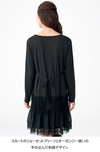 - ●素材/ニット天竺(ポリエステル67%、レーヨン33%) 100dシフォンジョーゼットクリスタルランダムプリーツ(ポリエステル100%) オーガンジーカットワーク刺しゅうレース(ポリエステル100%)