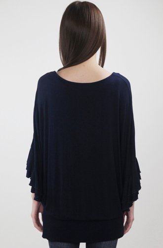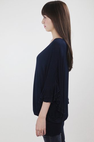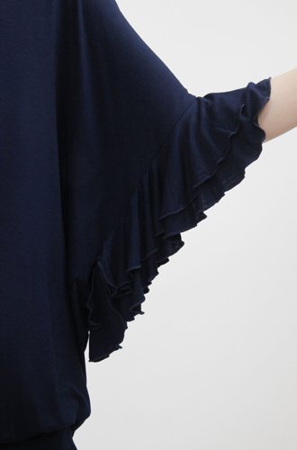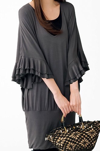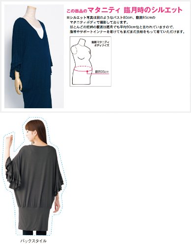 ドルマン風フレアスリーブは着る人をほっそりと見せ、大きくなるお腹も可愛くカバー
