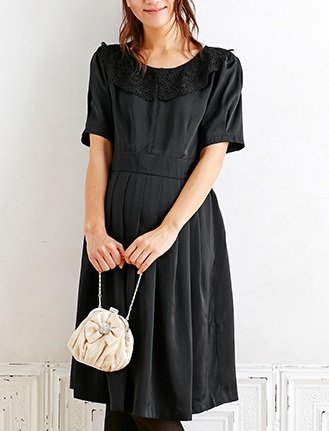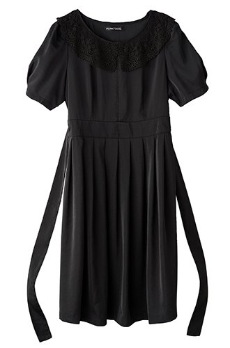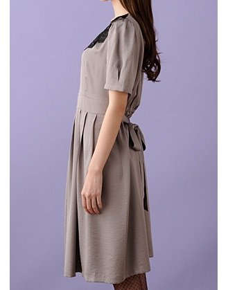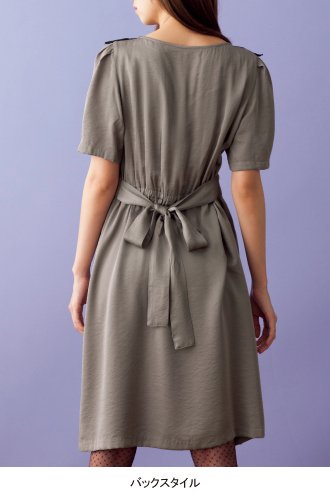 - ●前=ケミカルレース衿付、ウエスト=共布リボンベルト付調節可、切り替え下にタックプリーツ、後=切り替えにゴム入り