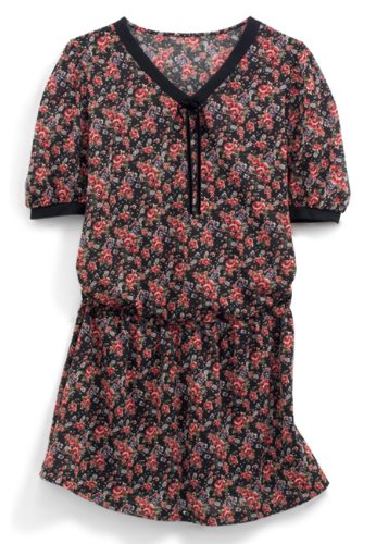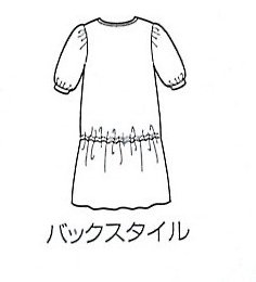 - ●前=衿ぐり&袖口無地切り替え、胸元に飾りサテンリボン付、ローウエスト切り替えにゴム入り