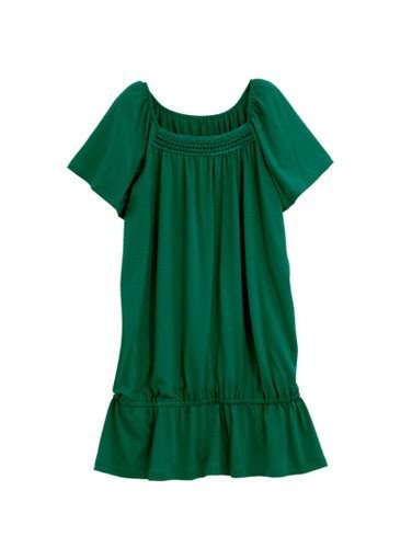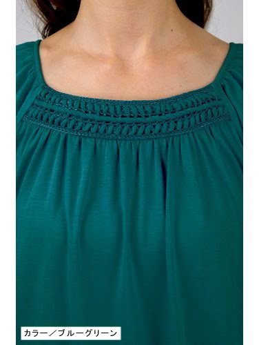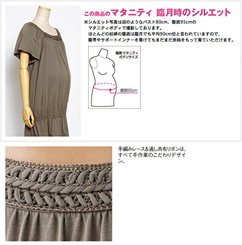 - ●前=胸元に手編みレース&通し共布リボン飾り 衿ぐりギャザー入り ローウエスト=切り替えにゴム入り ラグランフレアスリーブ