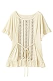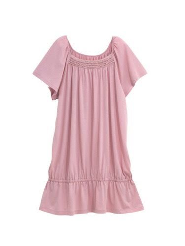 - ●前=胸元に手編みレース&通し共布リボン飾り 衿ぐりギャザー入り ローウエスト=切り替えにゴム入り ラグランフレアスリーブ