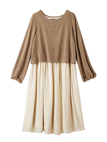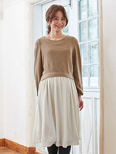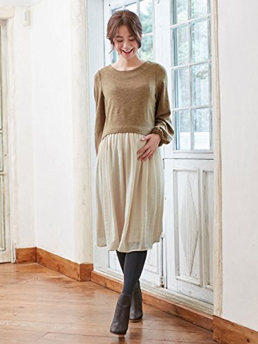 Angeliebe エンジェリーベ マタニティ ワンピース 授乳口付き ニットソー × ビンテージ サテン ドッキング ワンピ 妊婦服 産前 産後 長袖 M ~ L ブラウン × バニラ 22283 22283202