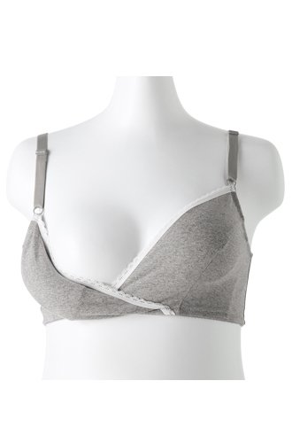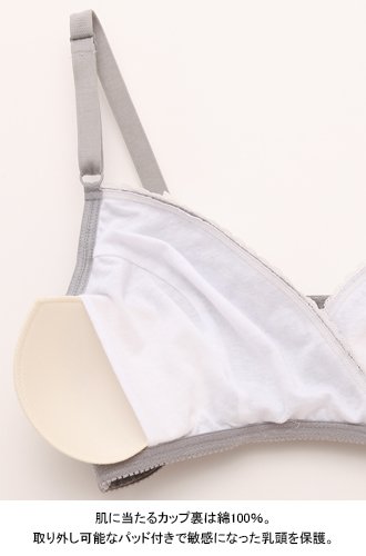 カップ裏はコットン100%で安心。授乳しやすいクロスオープンで甘くなり過ぎないレースがポイントです。