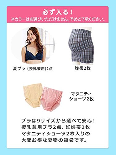 - ●妊娠スターターセットとしてもおすすめの大変お得な福袋です。ブラは9サイズから選べて安心!ムレにくくサラっとした着け心地の授乳兼用ブラ2点、ママの声から生まれたらくちんマタニティショーツ2枚、綿混素材でソフトなつけ心地のベルト付き妊婦帯が2点入っている計6点セット。10,690円(税込)相当のアイテムです。