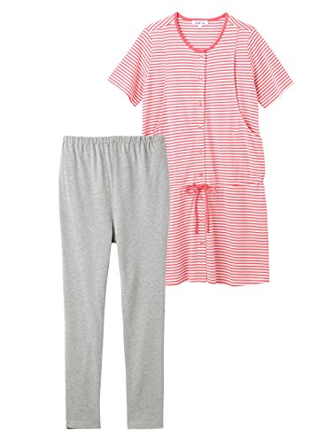 Angeliebe エンジェリーベ マタニティ パジャマ 授乳口付き 天竺 ボーダー ワンピ & 無地 パンツ ナイティ 妊婦服 産前 産後 半袖 前開き M ピンク 21821 21821160