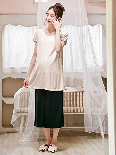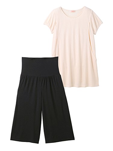 - ●【ホームウエアとしても着られるフェミニンコンビ】パジャマっぽくないデザインでホームウエアとしても使える上下セット。長めのチュニック&ガウチョのゆったりとしたシルエットが今年らしい雰囲気です。ガーリッシュな針抜き素材にパフスリーブやレースなどで甘さをプラス。