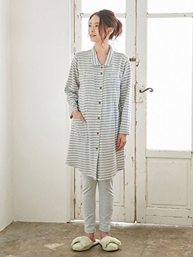 お腹を圧迫しないやわらか腹巻タイプのパンツがセットになったパジャマです。カジュアルなボーダーはベーシックな色味で使いやすく、ウッド調ボタンがナチュラルなアクセントになっています。