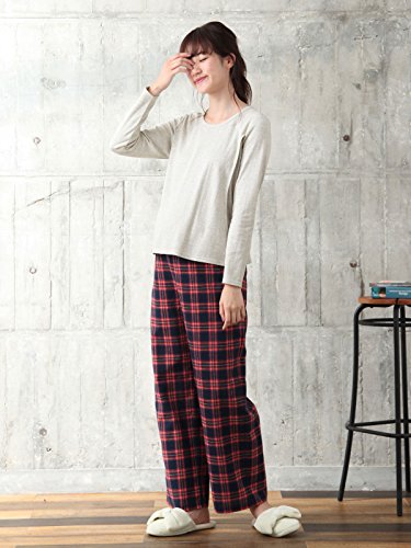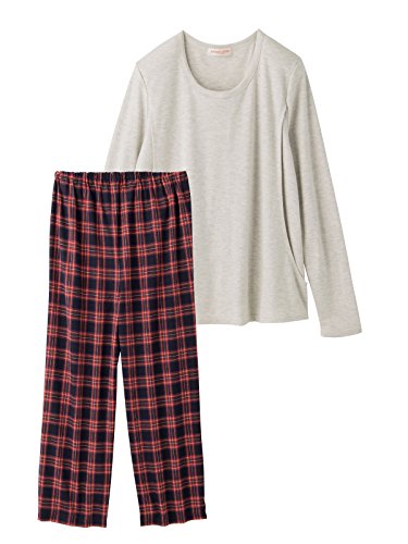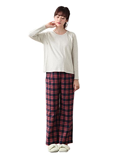 Angeliebe エンジェリーベ マタニティ パジャマ 授乳口付き スムース トップス & ネルチェック パンツ セット 妊婦服 産前 産後 長袖 S ~ M オートミール × ネイビーチェック 22081 22081201