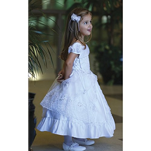 すてき洗礼ドレスでお子様用天使衣服。このキャップ袖のサテンのドレスと分割されたエプロンスカートは確かに彼女の外観を愛らしい。がグアダルーペの聖母embroidereの前面にスカートでできています。側面のボディスはレースUPS、ぴったりフィットします。アメリカ製。