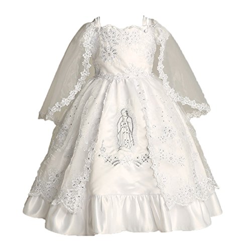 - この見事なサテンドレスはスカートの前面に刺繍されたグアダルーペの聖母のイメージで