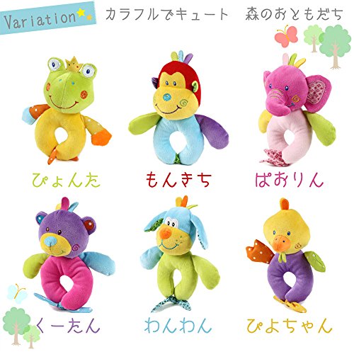 下で結ぶリボンもキュート♡ 視覚、聴覚、触覚と赤ちゃんの脳を刺激します。 カエルさん ヒヨコさん クマさん ゾウさん サルさん イヌさん すべての動物が可愛くて大人買いしそう!