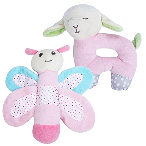 【Ani Mam Kids】ベビー用 かわいい 動物 ふわふわ にぎにぎ 音が鳴る アニマル 知育玩具 2点セット (メエメエ(ピンク)&ひらりん)