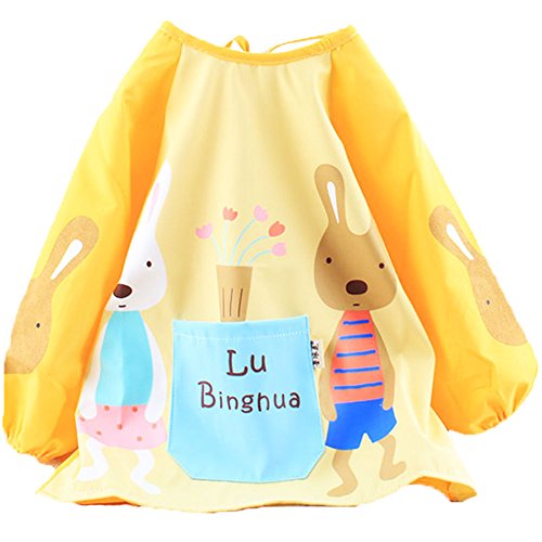 【Ani Mam Kids】子ども 用 長袖 スモック キッズ お遊び着 かわいい 割烹着 防水 保育園 幼稚園 入園準備 (L, イエロー)