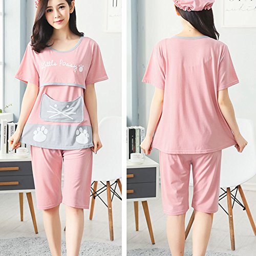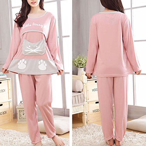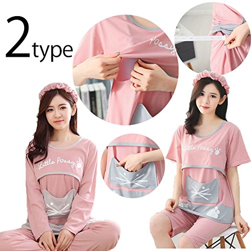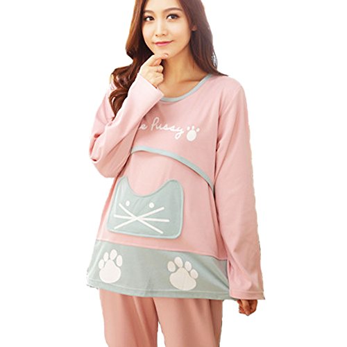 【Ani Mam Kids】猫 顔 が 可愛い ♡ マタニティ パジャマ 柔らか 授乳服 長袖 半袖 オールシーズン M~XXL(XXL, 長袖ピンク)