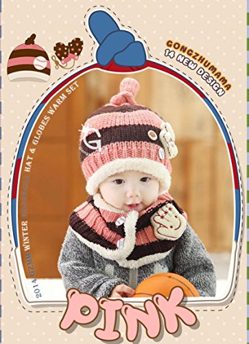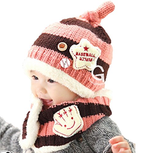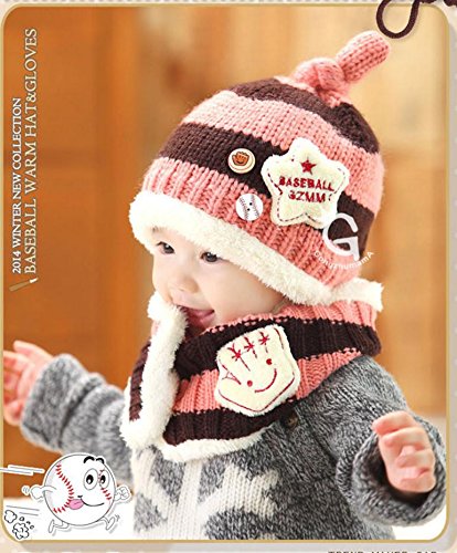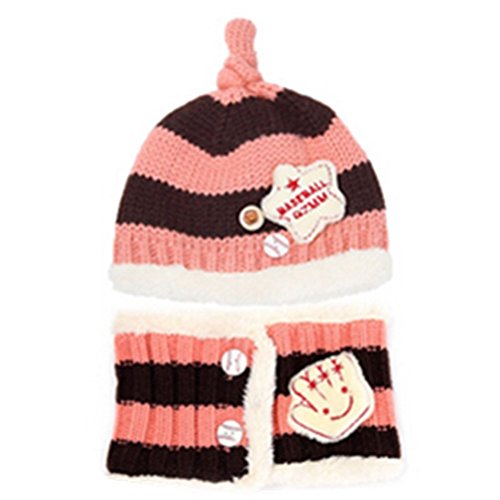 【Anjelly】 ベビー & キッズ 用 ニット帽 & マフラー (ボタン付き ネックウォーマー ) セット ベースボール 選べる6色 (ピンク×ブラウン)