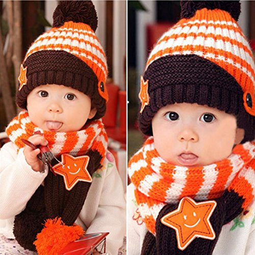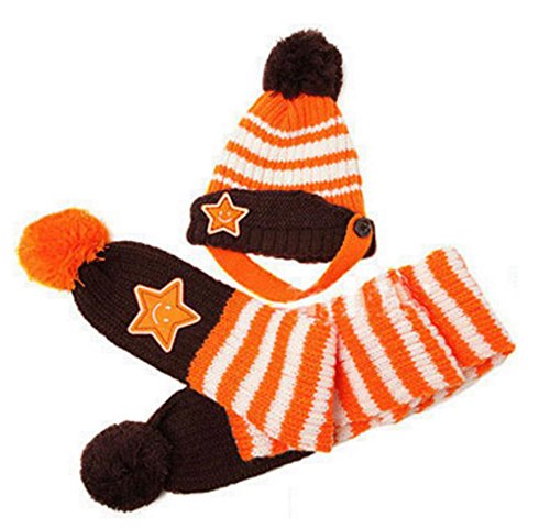【Anjelly】 ベビー & キッズ 用 ニット帽 & ロングマフラー セット かわいい ボーダー・スター おまけ付 選べる5色 (オレンジ)