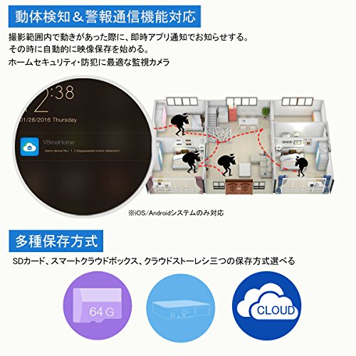 - 【簡単設定】防犯カメラ本体に電源を接続→アプリをダウンロード(QRコード付き、App Store(IOS)またはGoogle Playからダウンロードできる)→アプリをインストール→起動画面でログイン→カメラをアカウントに登録→ネットワーク接続(LAN/Wi-Fi)→録画設定(64GBまで対応できるSDカードへ録画/予約録画)→使用開始! ※ワイヤレス標準:2.4G WIFI(IEEE802.11b/g/n)