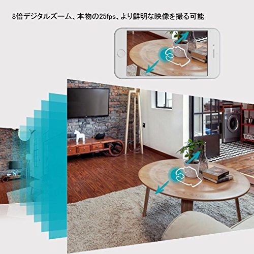 - 【超広角レンズ】ネットワークカメラレンズ可動範囲:水平方向350°、垂直方向100°。120°超広角レンズで、360°範囲の監視することができます。8倍デジタルズームで、本物の25fps、より鮮明な映像を撮ること可能です。