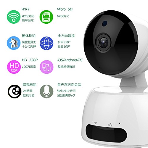 解像度は720P、100万画素で、首振り&暗視撮影機能付き、昼夜24時間監視できる。