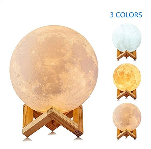 Moon Night Light 3d印刷、AOLVO USB充電式月の表面ランプ、スマートタッチコントロール3色LED夜ライト、ホームデコレーションライトwith木製ホルダー、直径5.9 in