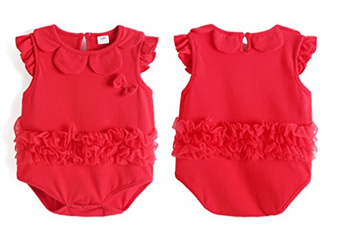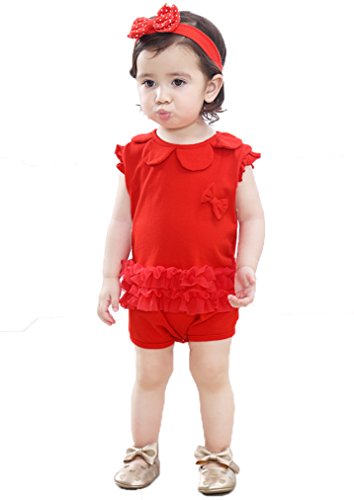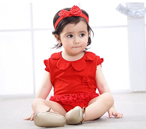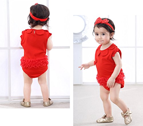 Asia Color ロンパース ベビー服 新生児 ふりふり おリボンヘアバンドセット オールインワン レース 誕生日 セレモニー バースデー (85cm, レッド)