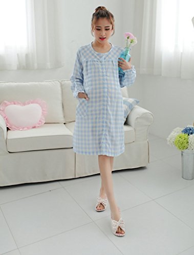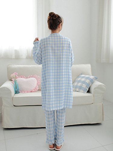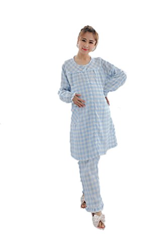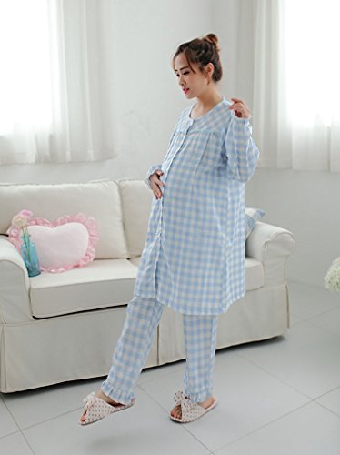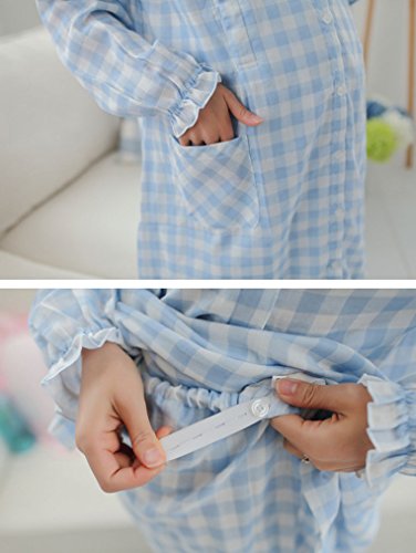 Asia Color パジャマ レディース 長袖 前開き チェック柄 上下セット 授乳口付き 可愛い 肌に優しいガーゼ生地 ルームウエア (M, ブルー)