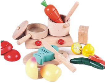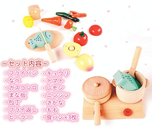 - セット内容:フライパン1、なべ1、ガスコンロ1、まな板1、包丁1、フライ返し1、ピーラー1、きゅうり1、トマト1、レモン1、ニンジン1、魚1、桃1、食パン×3