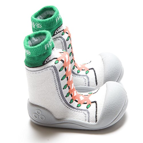 ソックスとシューズをドッキングした独特のフォルムは、赤ちゃんにとって自然に正しい歩行をサポートできるよう産学協同で生体力学の観点から研究を重ねて生まれました。