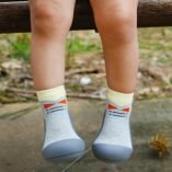 ソックスとシューズをドッキングした独特のフォルムは、赤ちゃんにとって自然に正しい歩行をサポートできるよう産学協同で生体力学の観点から研究を重ねて生まれました。