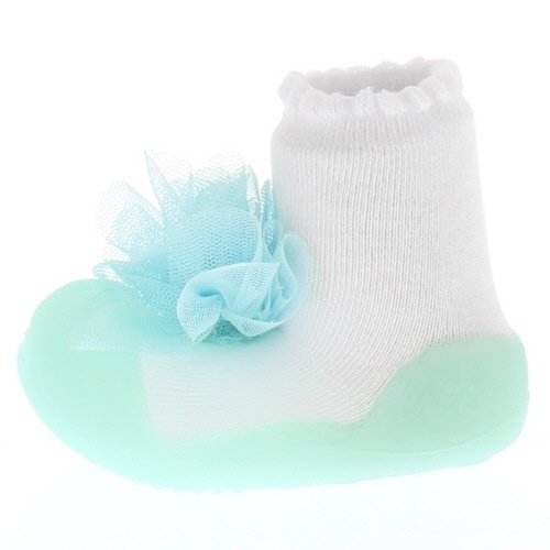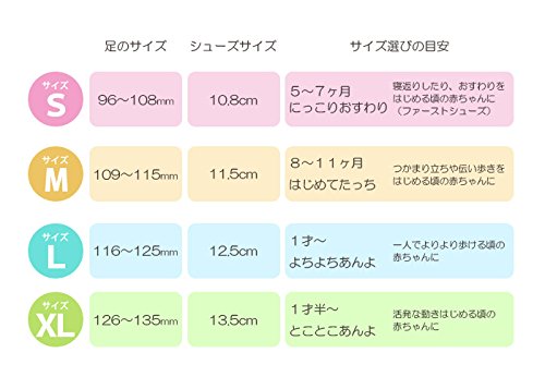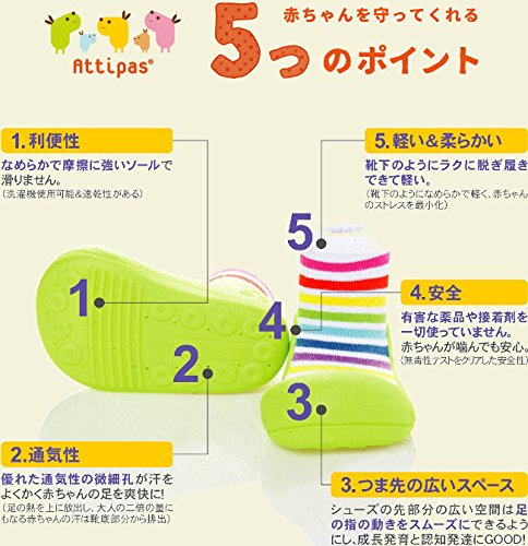 わたあめのように甘そうなパステルトーン。童話の中の主人公のように魅力的にするラブリーアイテム。お花のようなフワフワなコサージュがオシャレです 「アティパス」は、5か月~24カ月のよちよち歩きの赤ちゃんにぴったりのベビーシューズです。ソックスとシューズをドッキングして作られた独特のフォルムは、生体力学研究に基づいて作られており、赤ちゃんをやさしくサポートします。 つま先の広い設計や片足約40gという軽量感など、高い機能性が自慢です。ソックスのような柔らかさのAttipasは、つかみ立ちを始めたり、よちよち歩きの赤ちゃんのファーストシューズとしてもご利用いただけます。 靴下よりも保護力があり、冷えやすい足先や足裏がしっかりとラバーで覆われているので寒い時期の防寒グッズとしても活躍してくれます。 また、縫い目がなく接着剤も不使用なので、なんでも口に入れてしまう小さな赤ちゃんも安心してご使用いただけます <サイズ目安> S:10.8cm(足のサイズ:96~108mm、年齢:5~7ヶ月) M:11.5cm(足のサイズ:109~115mm、年齢:8~11ヶ月) L:12.5cm(足のサイズ:116~125mm、年齢:12ヶ月~) XL:13.5cm(足のサイズ:126~135mm、年齢:18ヶ月~) <素材> アッパー: 綿、ナイロン、ポリエステル、ポリウレタン アウトソール: TPR 原産国:韓国