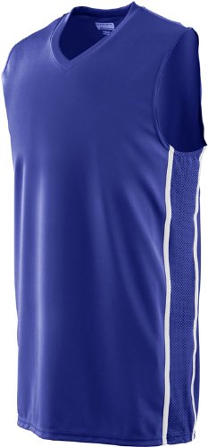 Augusta SPORTSWEARユース生地ポリエステルノースリーブジャージーとメッシュ: 100ポリエステルニットが挿入され92 %ポリエステル/ 8スパンデックスピンホール、メッシュバック、インサート、湿気を吸収して外に出す;ヒートシールラベル共布マイターVネックの襟;にコントラストのあるカラーストライプ側面ができます準拠していることをNFHS規制。
