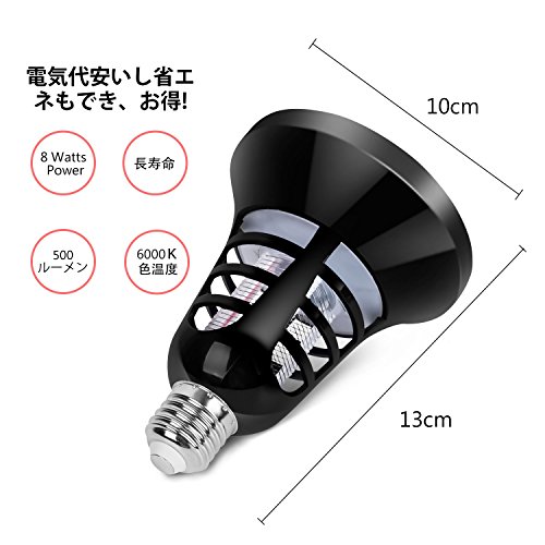 - 【強力蚊除け&省エネ】害虫の好きな光を採用され、飛んでいる蚊や虫などを誘い、電球にぶつかった瞬間に高圧電流で退治します。8W低消費電力で長時間付けても電気代は安くて経済的です。