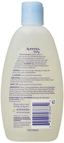 Wash & Spampooは、天然オーツ麦エキス配合の泡立ち豊かなクレンザーです。石鹸成分が入っていなくて低刺激性なので、乾燥させることなく洗浄します。この目を痛める成分の入っていないフォーミュラは、やさしいクレンジングで、肌や髪に使用することができ、ソフトでフレッシュな香りできれいに洗い流します。Aveeno BabyのWash & Shampooは、敏感肌の新生児や赤ちゃんにも十分優しくあるように処方されています。 Aveenoは、赤ちゃんの肌や髪を、柔らかく滑らかで健康的な感じに保つために、毎日お使いいただけます。 Aveenoブランドは、60年以上、小児科医に推奨されています。 濡れた洗浄タオルか手に取り、髪と体につけてください。または、お風呂のお湯に直接注いでください。泡立てて使い、洗い流してください。