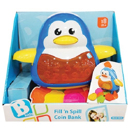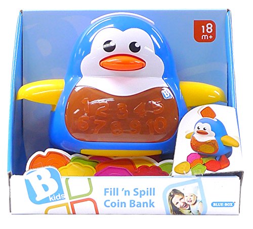 With BKids fill 'n' spill coin bank, tots will pop vibrant coins into the penguin's head while pressing its wings allows the coins to slide out;This adorable smiling birdie bank features a see-through tummy and 10 attractive, sturdy coins in different shapes and sizes;Portable, durable and recommended for girls and boys 18-36 months